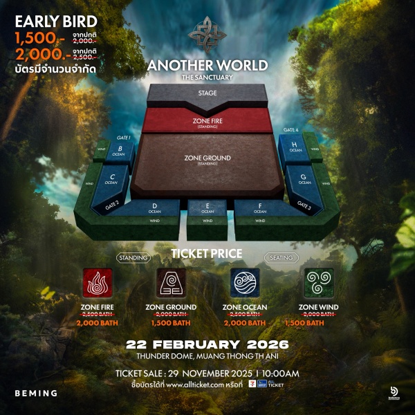 ประกาศศักดาอย่างยิ่งใหญ่ “ANOTHER WORLD: THE SANCTUARY CONCERT” งานที่จะพาคุณเดินทางผ่านประตู Sanctuary ไปสู่ค่ำคืนแห่ง “Another World” ในวันที่ 22 กุมภาพันธ์ 2569 ที่ Thunder Dome เมืองทองธานี โดยสามารถกดสั่งซื้อบัตรได้แล้วทาง ALLTICKET หรือที่ Counter Service All Ticket 7-Eleven ทุกสาขา พร้อมกันวันที่ 29 พฤศจิกายนนี้