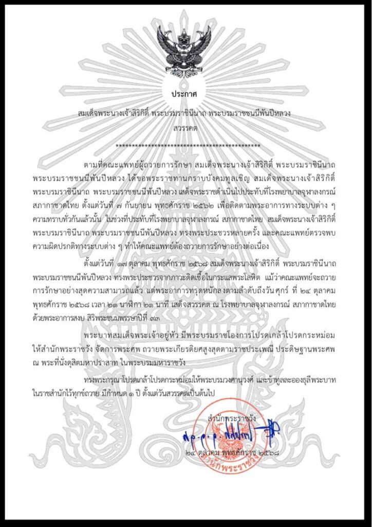 สำนักพระราชวัง เผยแพร่ประกาศ สมเด็จพระนางเจ้าสิริกิติ์ พระบรมราชินีนาถ พระบรมราชชนนีพันปีหลวง สวรรคต