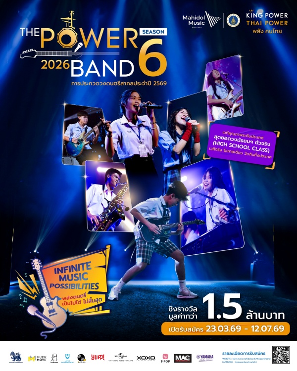23 มีนาคม 2569 – เปิดศึกวงดนตรีมัธยมฯ ระดับประเทศ! คิง เพาเวอร์ ไทย เพาเวอร์ พลังคนไทย ผนึกกำลังวิทยาลัยดุริยางคศิลป์ มหาวิทยาลัยมหิดล พร้อมด้วย 7 ค่ายเพลงระดับประเทศ ได้แก่ Muzik Move, Smallroom, LOVEiS Entertainment, What The Duck, XOXO Entertainment, YUPP! Entertainment และUniversal Music Thailand ร่วมด้วย Singha Corporation,T-POP STAGE, The Guitar Mag และYamaha Music Thailand เดินหน้าสานฝัน ปั้นเมล็ดพันธุ์ทางดนตรี เปิดรับสมัครเวที THE POWER BAND 2026 SEASON 6 การประกวดวงดนตรีสากลประจำปี 2569 เวทีคุณภาพระดับประเทศ สุดยอดวงมัธยมฯ ตัวจริง ภายใต้แนวคิด “INFINITE MUSIC POSSIBILITIES : พลังดนตรี เป็นไปได้ ไม่สิ้นสุด” เปิดโอกาสให้เยาวชนมีพื้นที่ในการแสดงพลังแห่งความเป็นไปได้ ฝึกฝนทักษะด้านดนตรี นำความรู้ ประสบการณ์ที่ได้รับไปต่อยอดในอนาคต