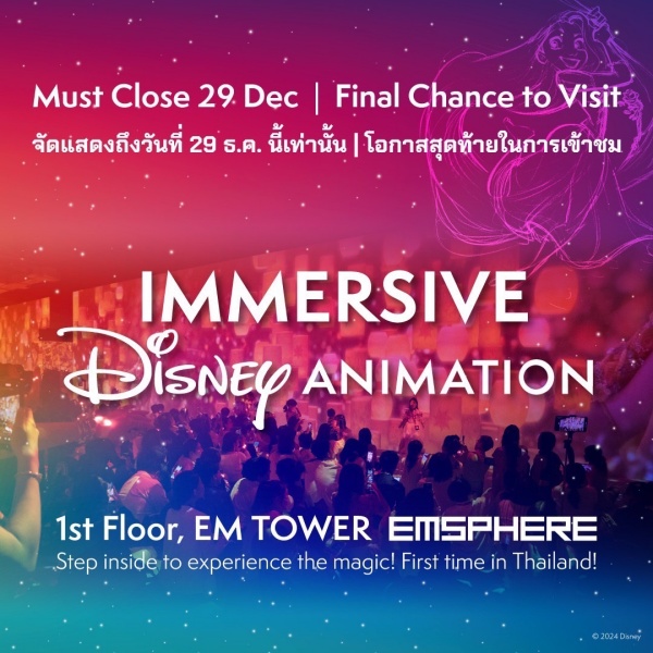 และเมื่อความสุขและความทรงจำนี้กำลังจะปิดฉากสำหรับแฟนดิสนีย์ชาวไทยในวันที่ 29 ธันวาคม 2567 นี่จึงเป็นโอกาสครั้งสำคัญที่คุณไม่ควรพลาด! สัมผัสนิทรรศการที่พาคุณย้อนเวลากลับไปสู่ความทรงจำอันอบอุ่นและน่าประทับใจ ด้วยการนำเสนอแบบอินเตอร์แอคทีฟที่สมจริง พร้อมบทเพลงจากแอนิเมชันเรื่องโปรดที่คุณรัก เช่น The Lion King, Frozen, Beauty and the Beast และอีกมากมาย